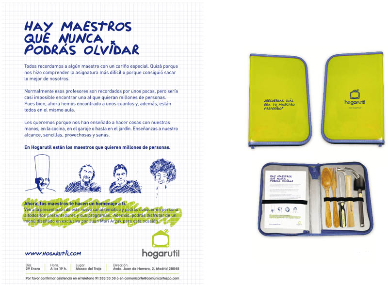 A diferencia de un canal convencional de TV, los espectadores de Hogarutil deben tener una actitud activa para aprender diferentes materias. Podríamos decir que es una escuela que emite en TV. Por este motivo, realizamos un envío consistente en un estuche escolar, pero en vez de lápices y pinturas, contenía los utensilios que se usan en los programas así como la invitación a la presentación.